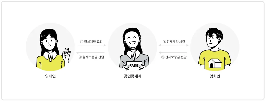 임대인 없이 중간에서 공인중개사가 대리인으로 계약을 하는 관행이 있습니다. 집주인이 멀리 있거나 바쁜 경우 공인중개사가 모든 계약을 대신하는 경우인데요. 집주인에겐 월세로 계약한다고 속이고 세 들어오는 사람에겐 전세라고 속여서 중간에서 보증금을 가로채는 경우가 있습니다. 집주인에겐 보증금 1천만 원에 월세로 계약했다고 속이고, 세입자에겐 9천만 원 전세보증금을 받아 8천만 원의 차액을 남겨 양쪽 다 속이는 거죠.