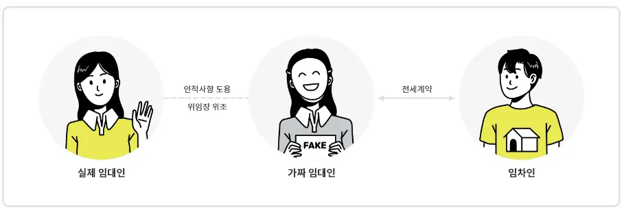 임대인이 아니면서 임대인인척 명의를 도용하여 중간에서 이 가짜 임대인이 세입자의 보증금을 가로채는 경우가 있습니다. 혹은 임대인의 위임장 또는 증명서류를 위조하여 대리인 행세를 하여 세입자의 보증금을 가로채기도 합니다.