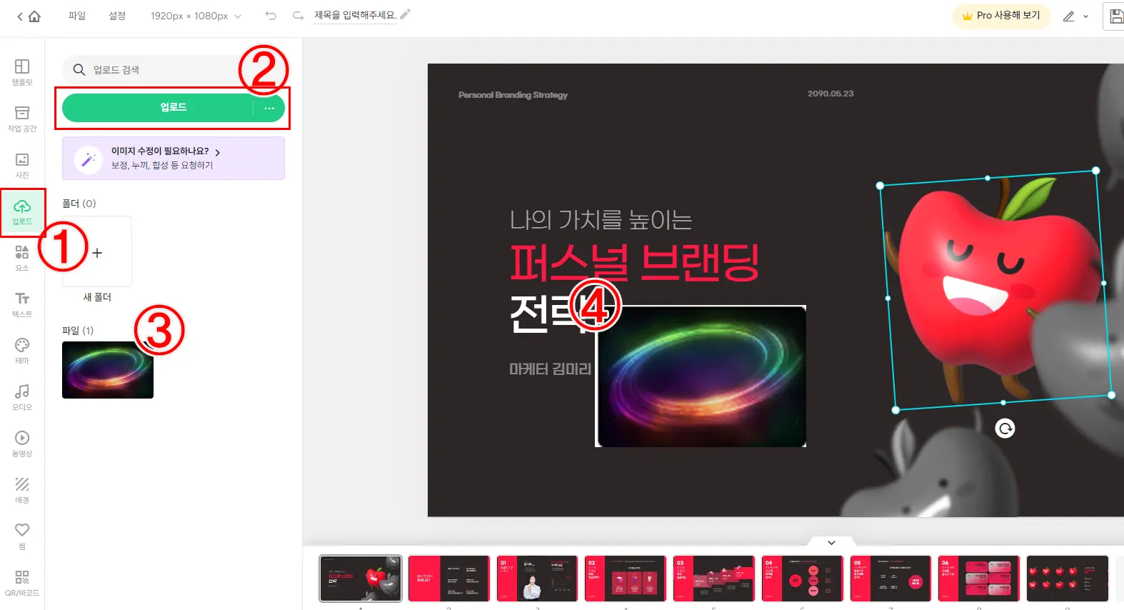 ① 좌측 편집창 - [업로드] 탭을 선택