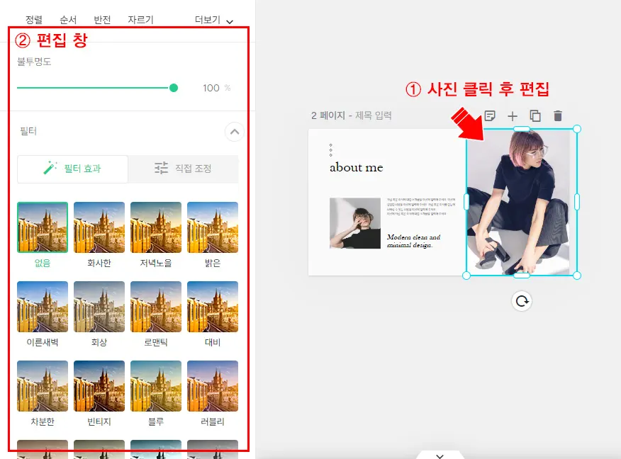 ° 사진 편집 : 사진 클릭 후 왼쪽 편집창에서 수정