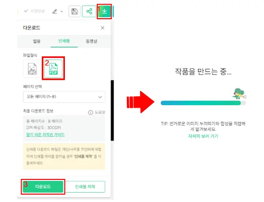 상단에 다운로드 버튼을 눌러 저장합니다. 웹용, 인쇄용, 동영상 중 원하는 용도로 선택하시면 됩니다.