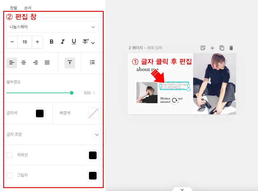 - 폰트, 투명도, 배경색, 정렬 등 의 편집이 가능합니다.