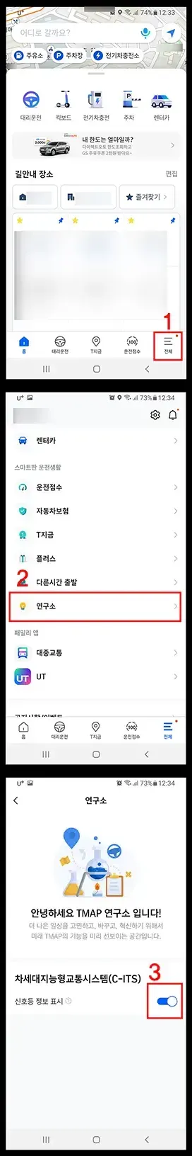T맵을 실행하신 후 우측하단의 전체 탭을 클릭해서 연구소라는 탭을 찾습니다. 거기에 우리가 원하는 설정이 나옵니다.