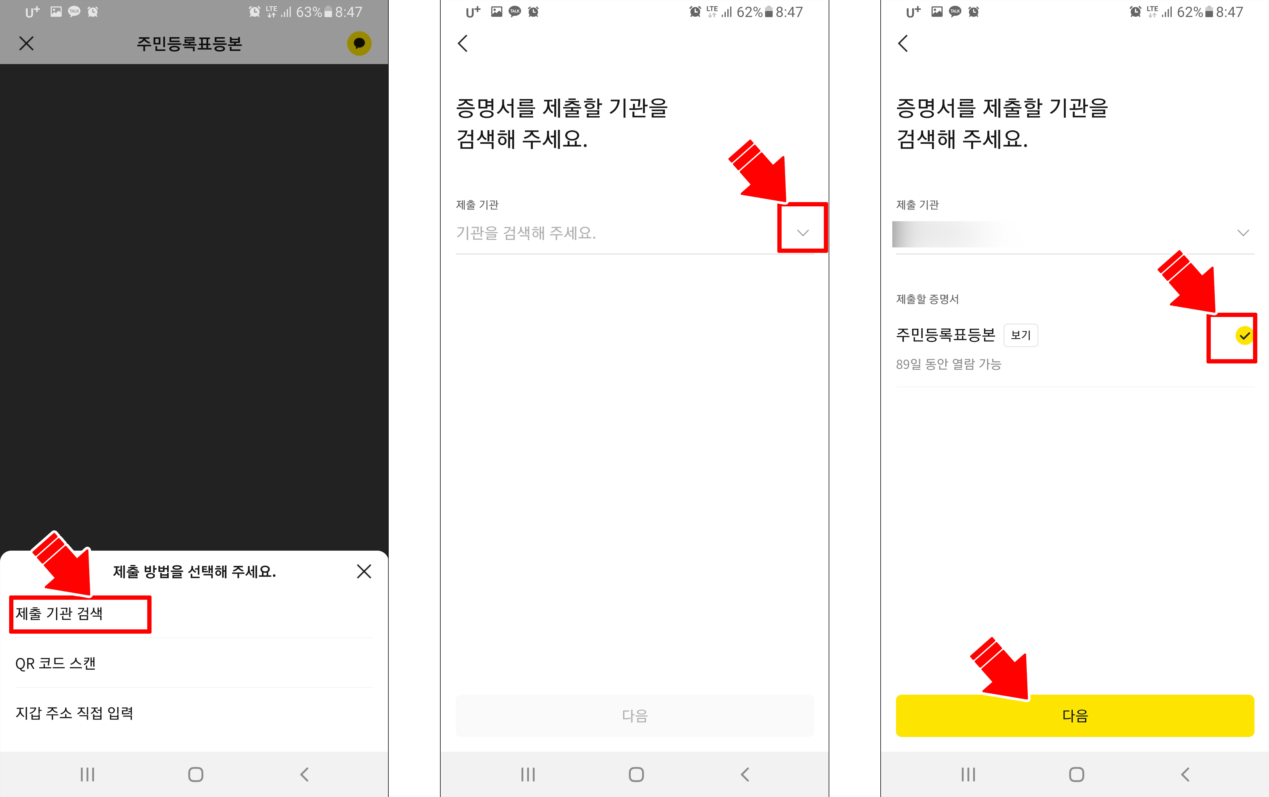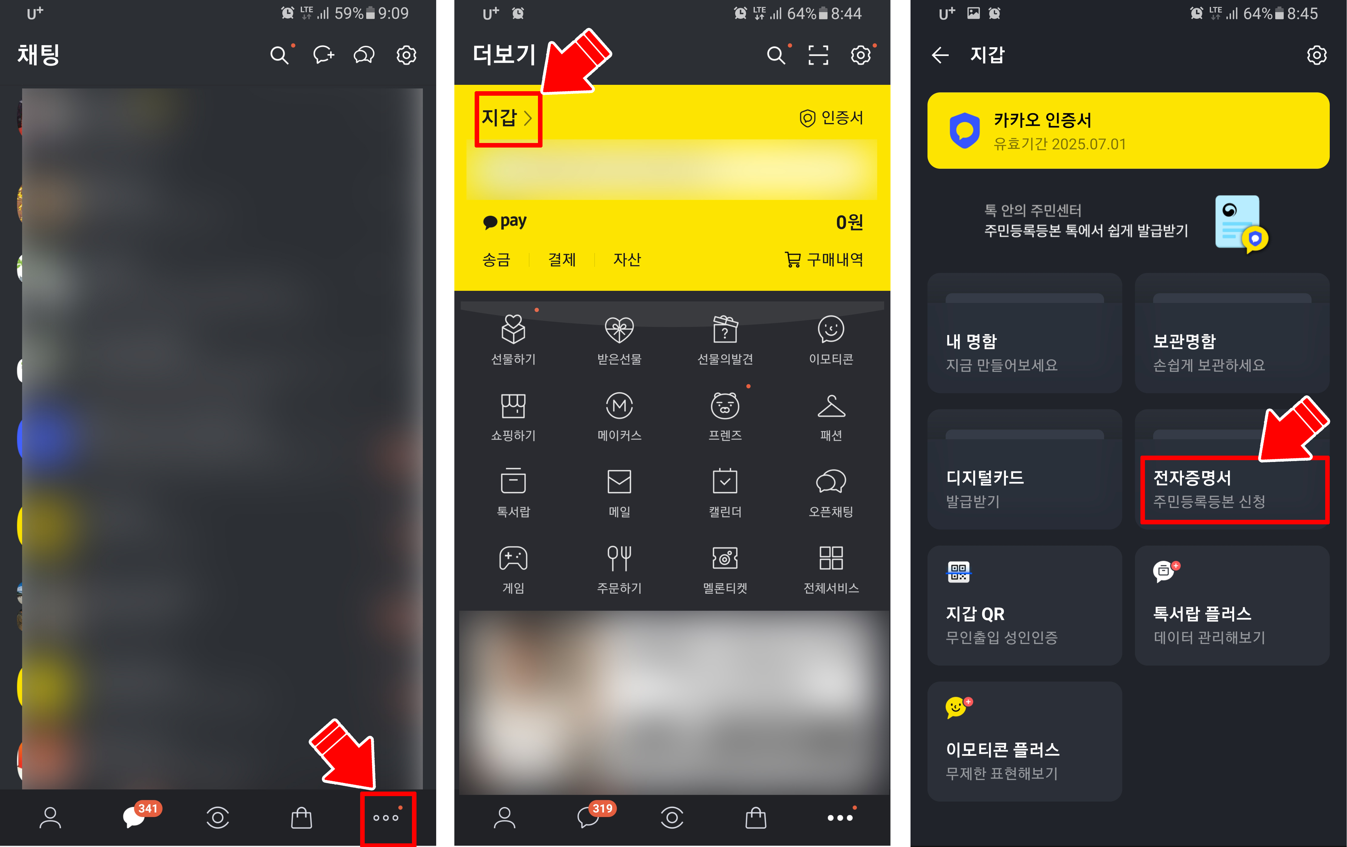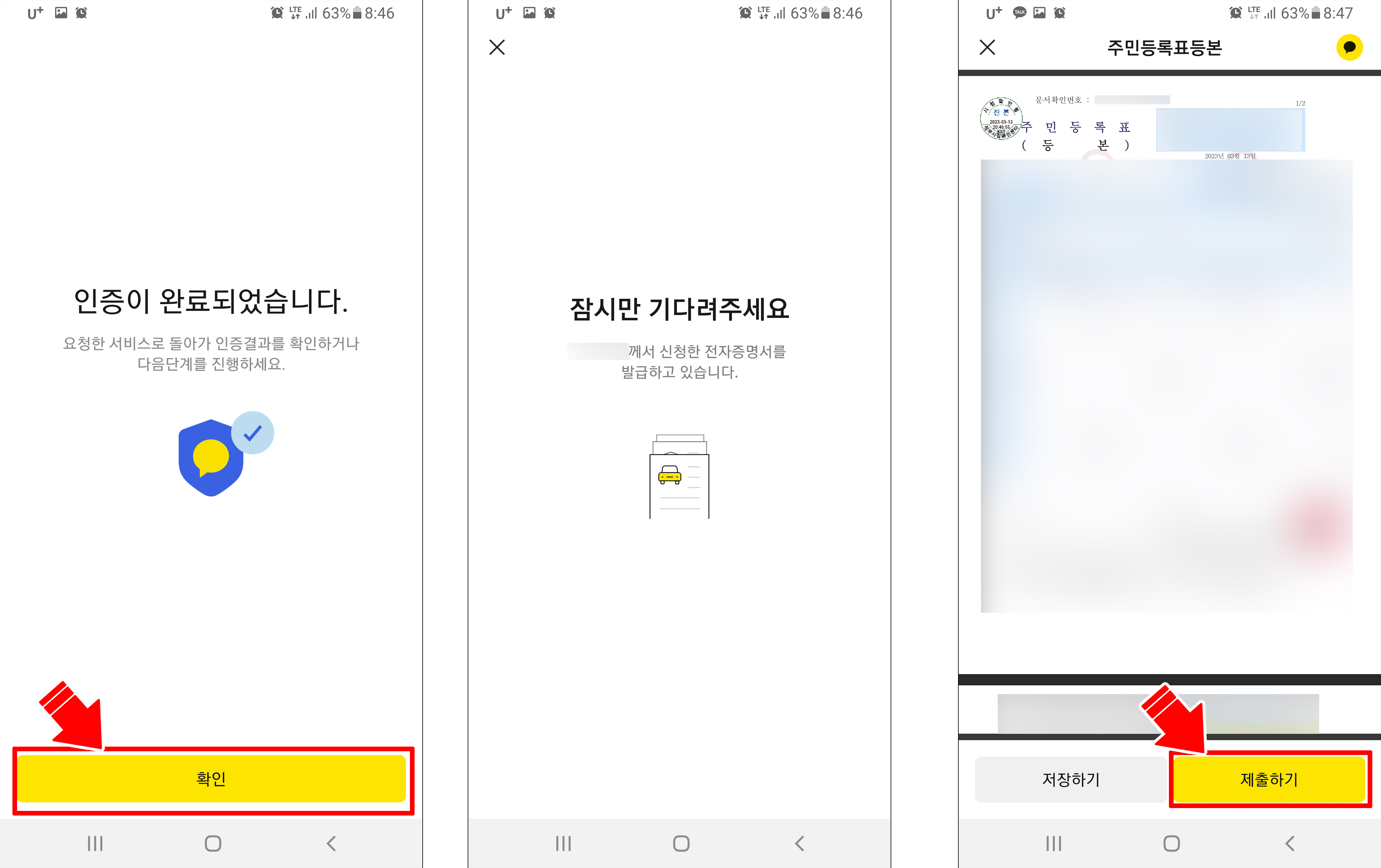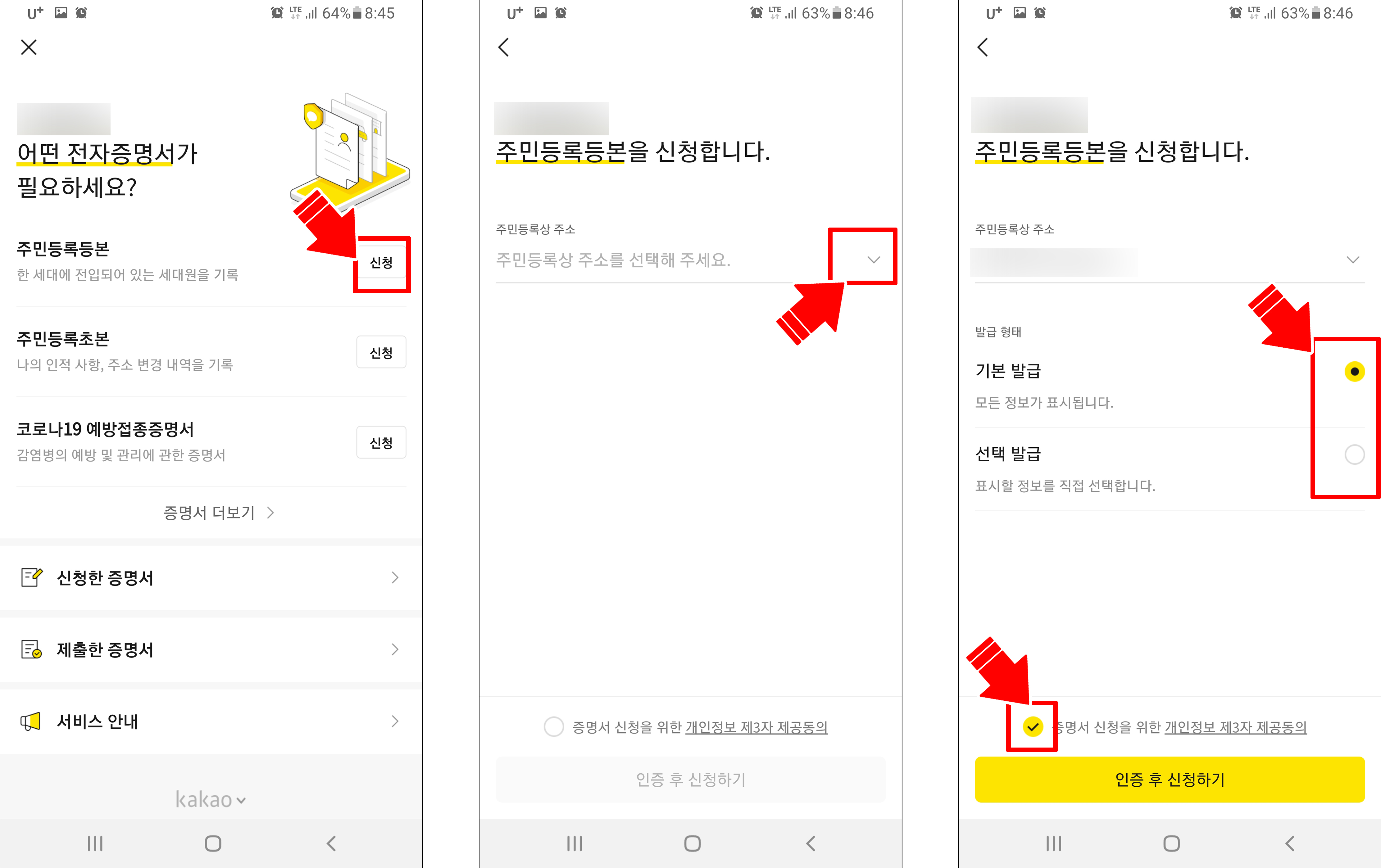 아래 이미지를 보시면 이해가 편하실 겁니다. 순서대로 빨간 화살표를 따라 하시면 모바일에서 카카오톡으로 주민등록등본 발급하는 법을 손쉽게 해결 하 실 수 있습니다.